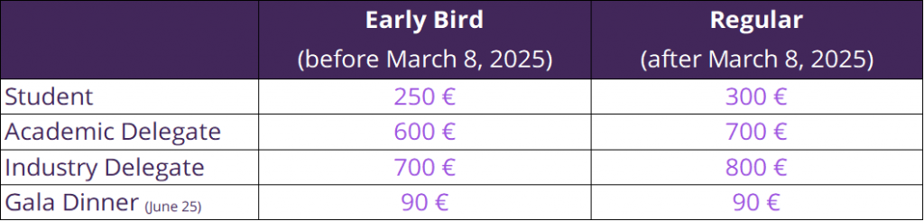 Note: Gala Dinner will take place on June 25 and is not included in the standard registration fees. Attendance will require an additional fee of 90 euros + VAT.